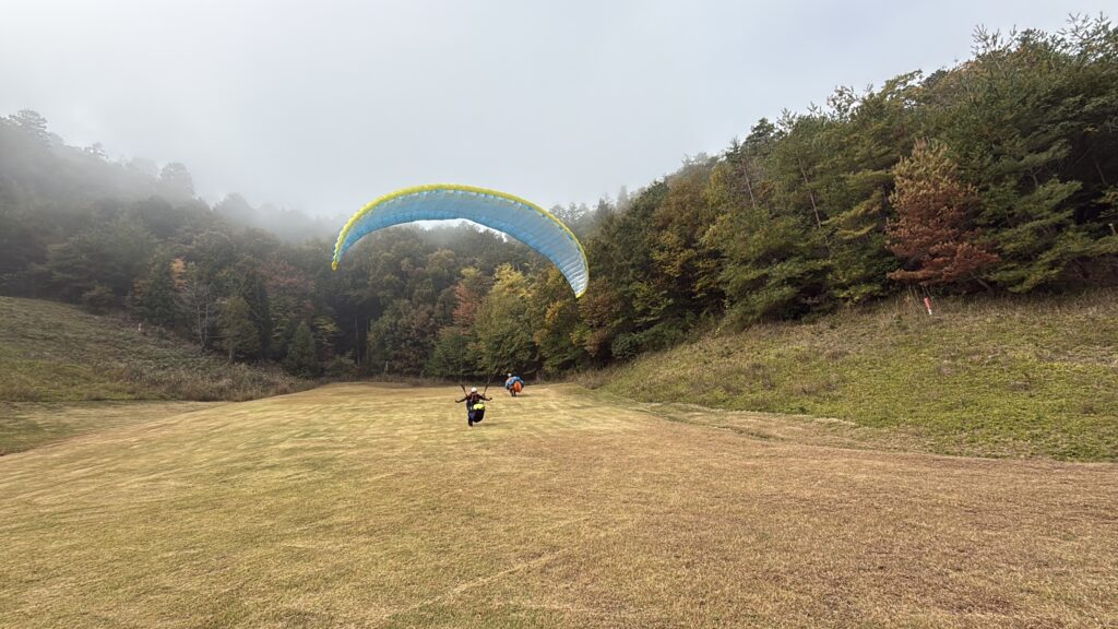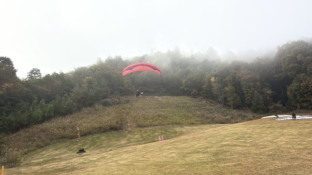 朝はしっかりと霧が発生。地上練習は弱い向かい風で穏やかでした。晴れてくると風の変化があり風待ちしながら練習継続。お昼前に風が強くなってリバース練習。さらに風がパワーアップして終了となりました。