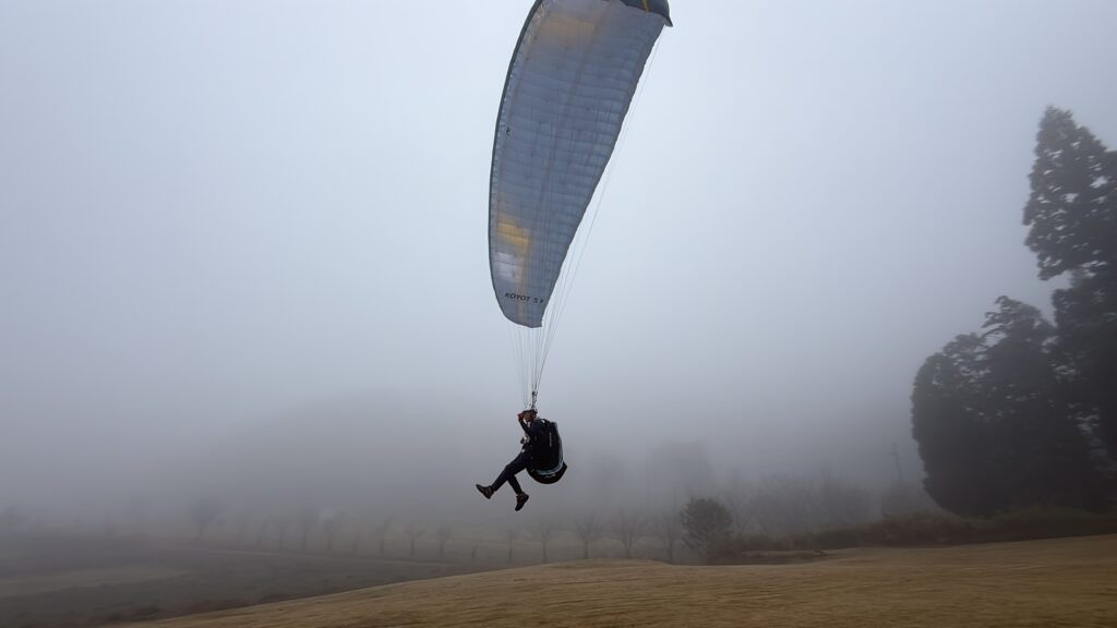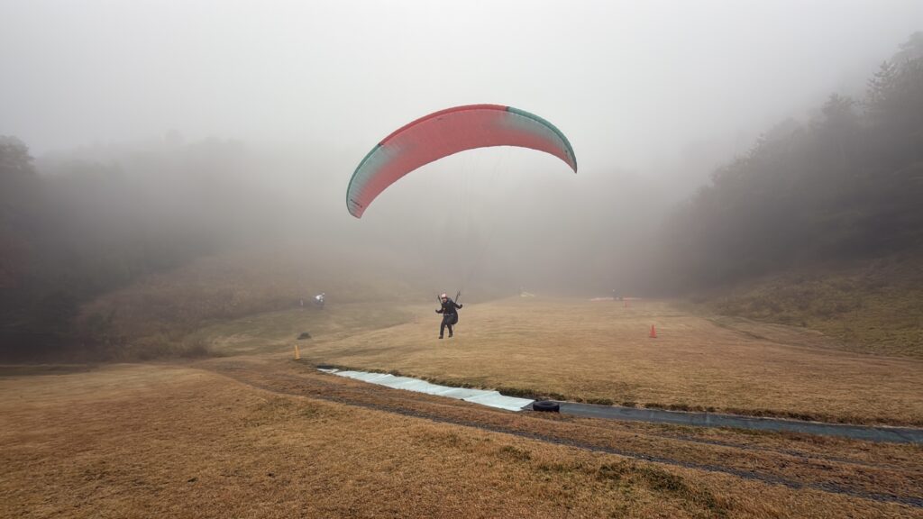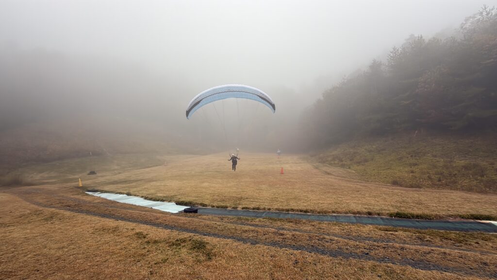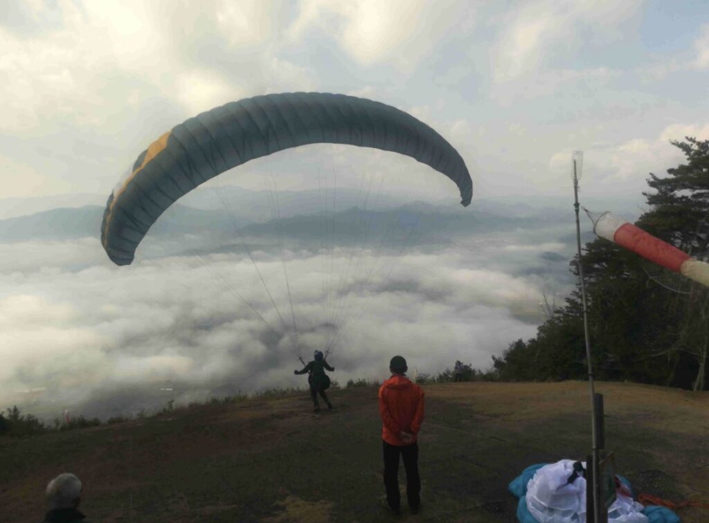 パラパークは見事な雲海。11:30ごろに晴れ間が見えてきてフライト開始。穏やかな風は一日中続き、数名だけ上昇気流に乗れました。