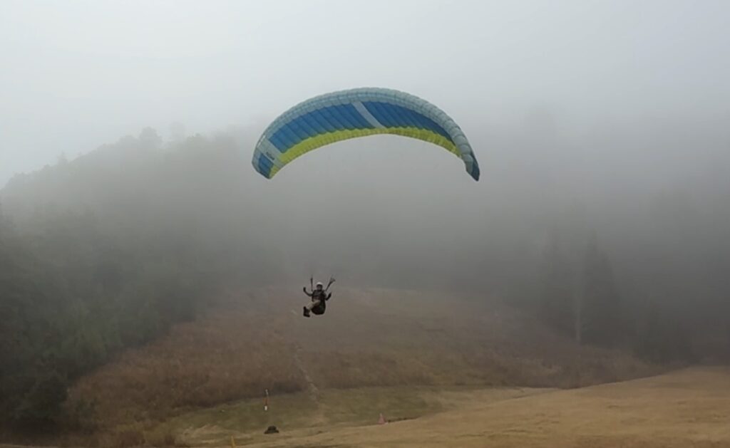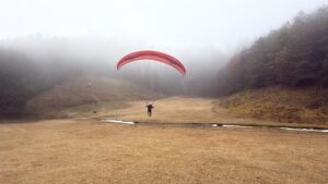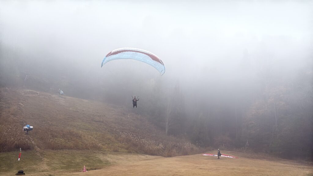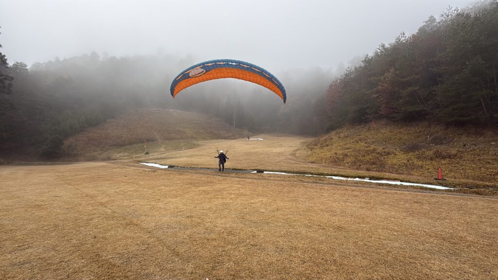 霧が出て穏やかに基本練習ができました。パラパークに風向計では南東強めなので11:00まで練習。パラパークはやはり南東が強いのでツリーラン時の練習を行いました。