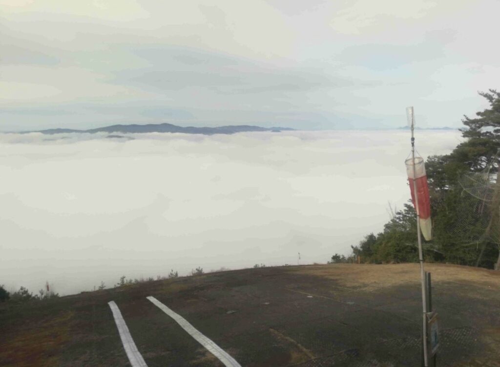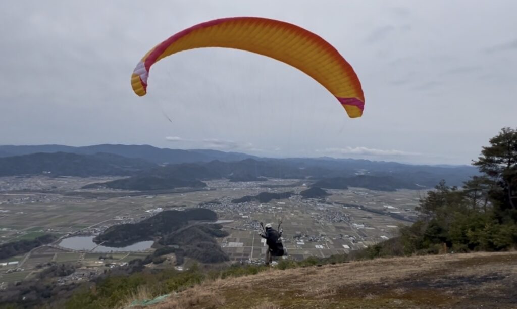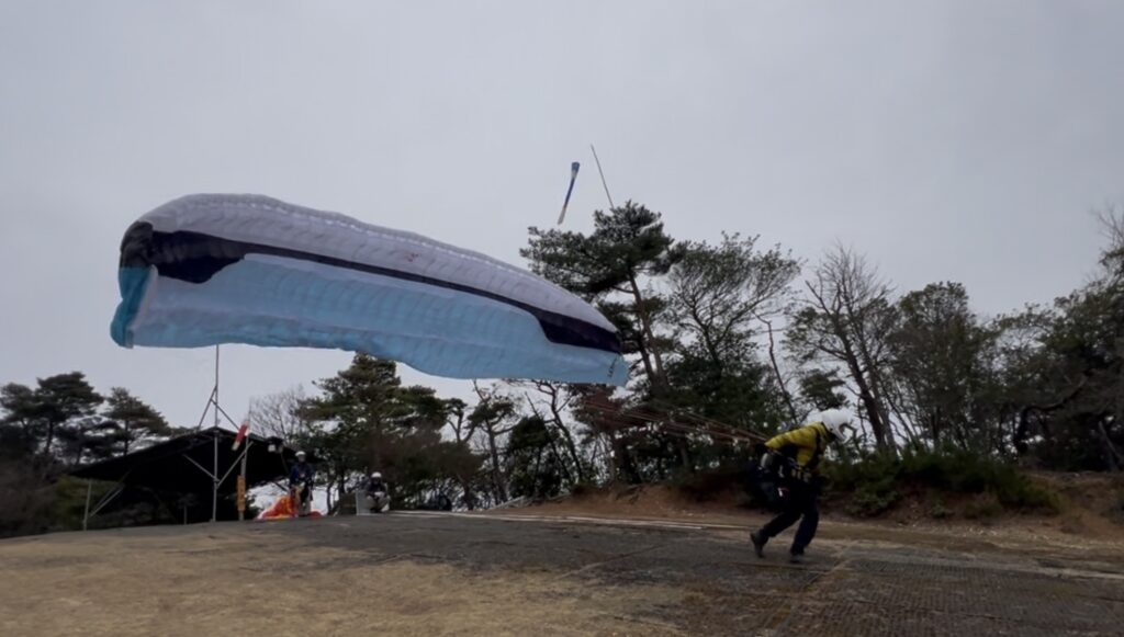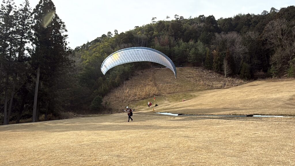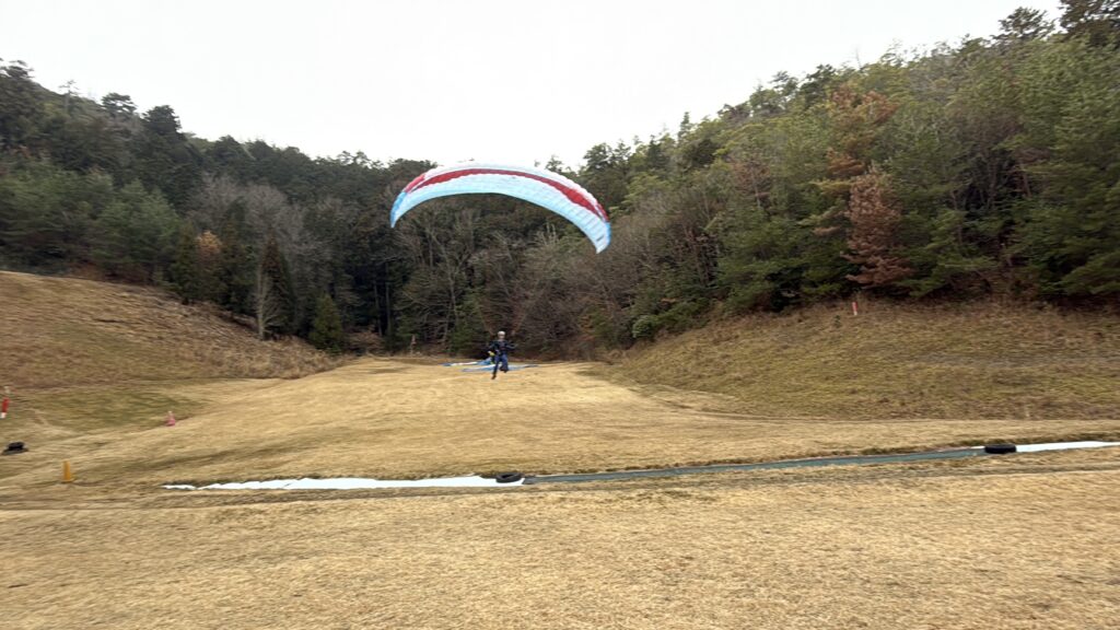 朝は上空に霧。地面は乾いており、弱い向かい風で緩斜面と30mから飛べました。