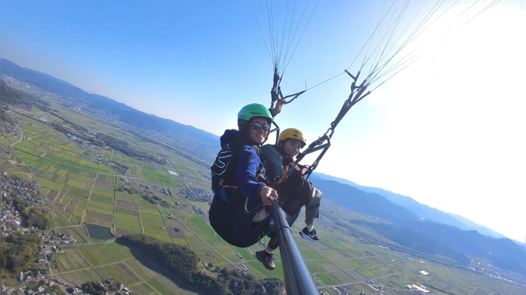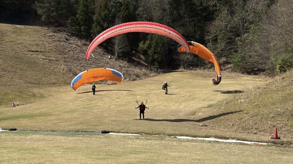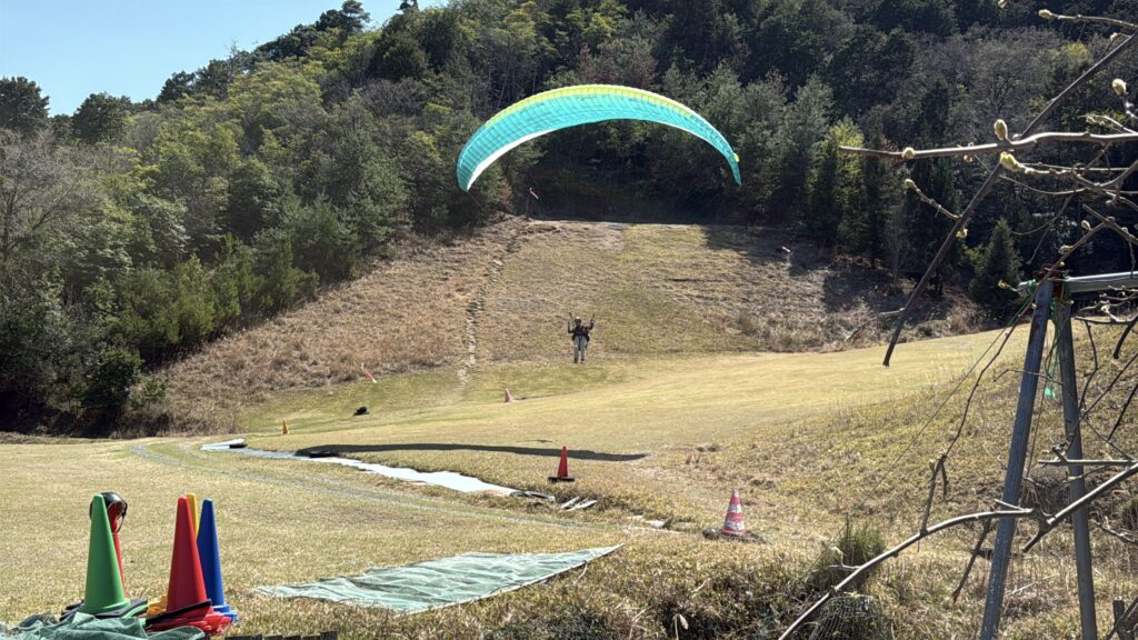 朝からスッキリ晴れて、良い風で練習できました。弱い風がすぐに割と吹いてきてリバースの練習ができました。安全に練習できる強さで楽しめました。30mも200mも飛べました。夕方のパラパークタンデムも大成功でした♪